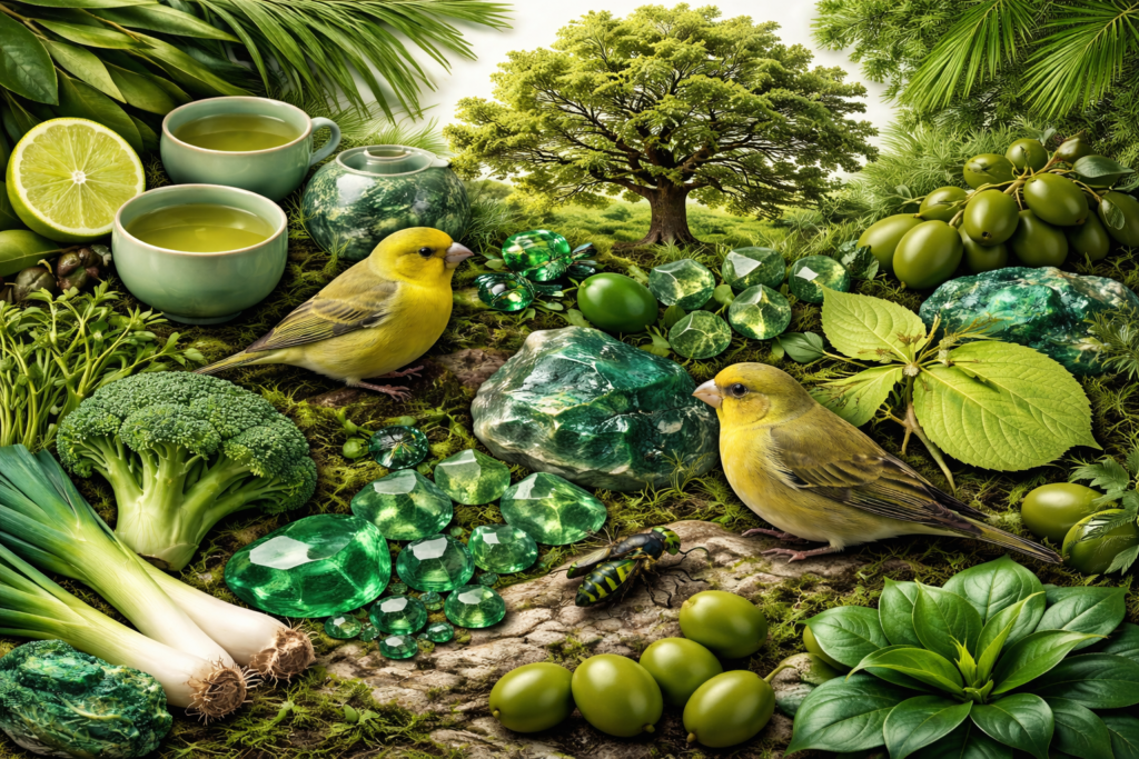 Après le rouge et le jaune des semaines passées, explorons les mots dont la définition contient le mot vert. On retrouve principalement des éléments du monde naturel, comme de nombreuses plantes et quelques animaux, mais aussi des substances, des pigments, des objets ou encore des termes scientifiques.
