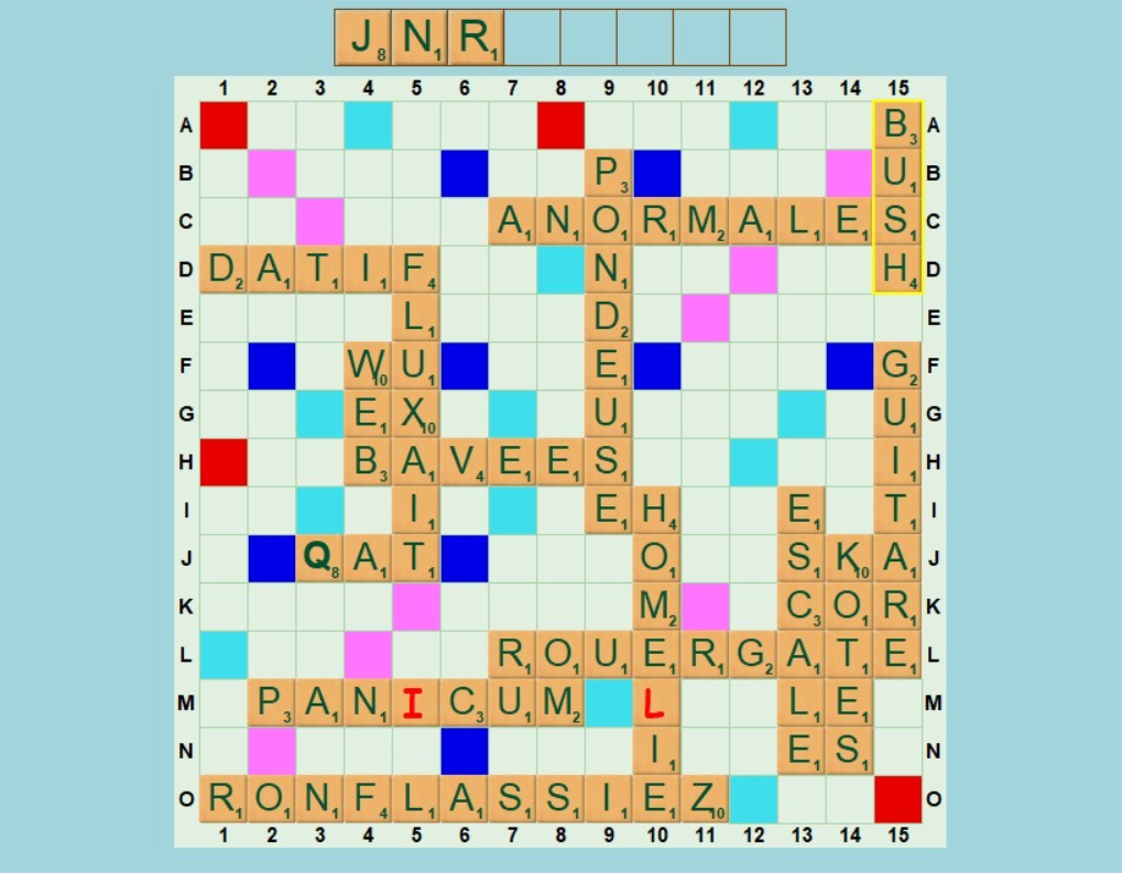 On joue BUSH en 15A pour 49 points. Zut, on n'aura pas la place pour le préfixe GEORGEW....