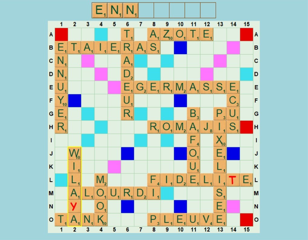 Solution coup n°15 : Votre joker est en Y et pour 68 points vous jouez WILAYA en 2J