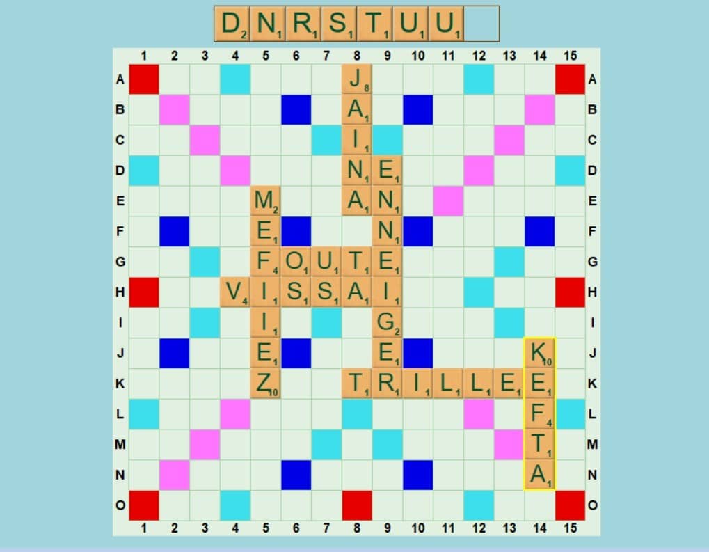 Tirage coup n°8 : vous rejetez votre reliquat composé de OA et joker, et vous repiochez 7 nouvelles lettres : DUTSUNR