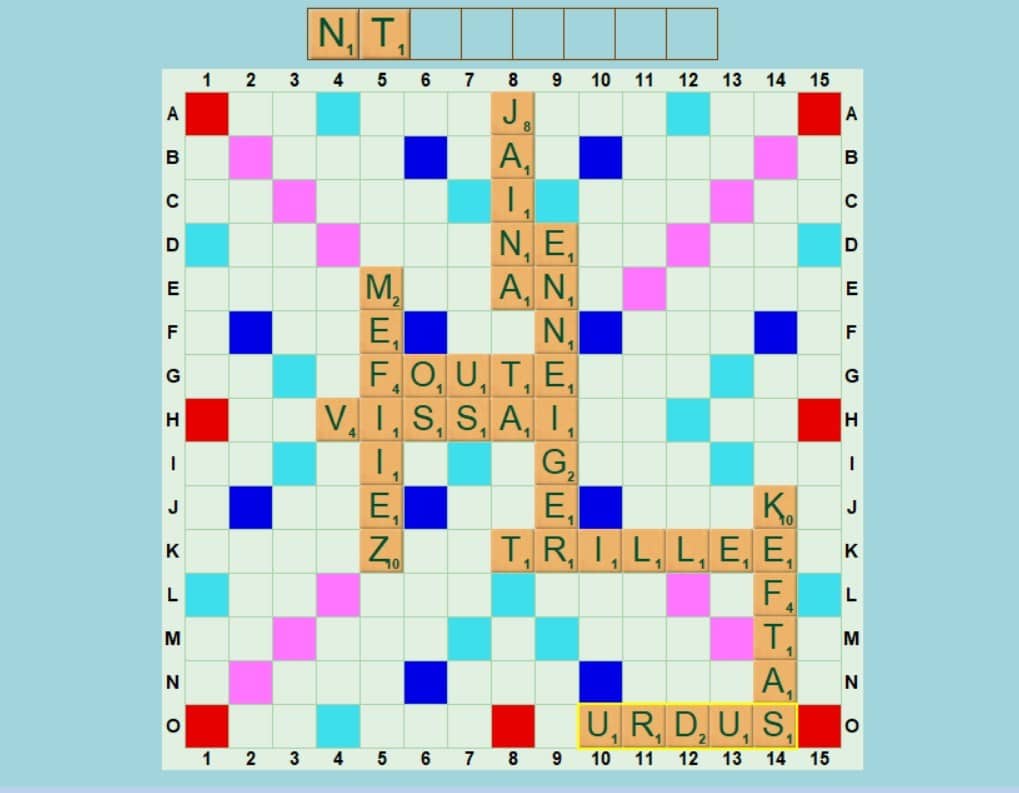 Solution coup n°8 : posez URDUS en O10 pour 26 points, mettant un S à KEFTA
